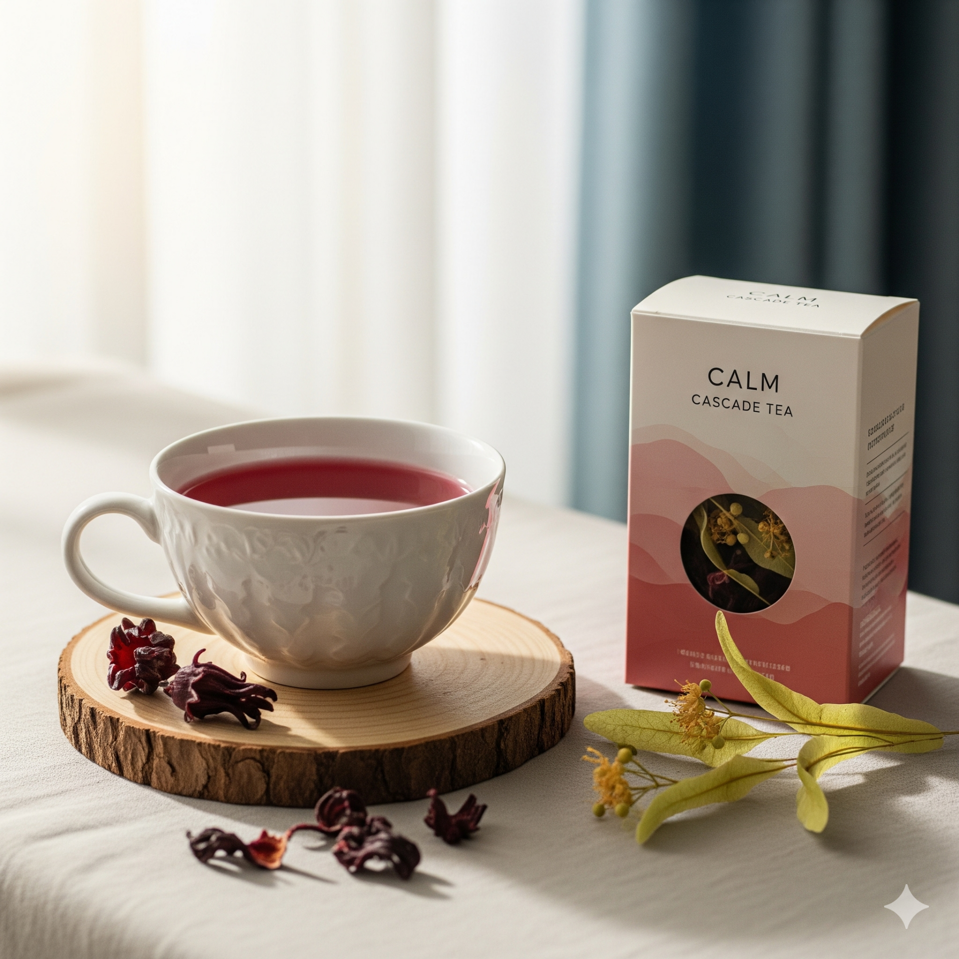 "Unwind with a cup of Calm Cascade Tea, your daily ritual for a tranquil moment. This beautiful blend features vibrant hibiscus, traditionally known for its rich color and soothing flavor, and delicate linden flower, long cherished for its calming properties.